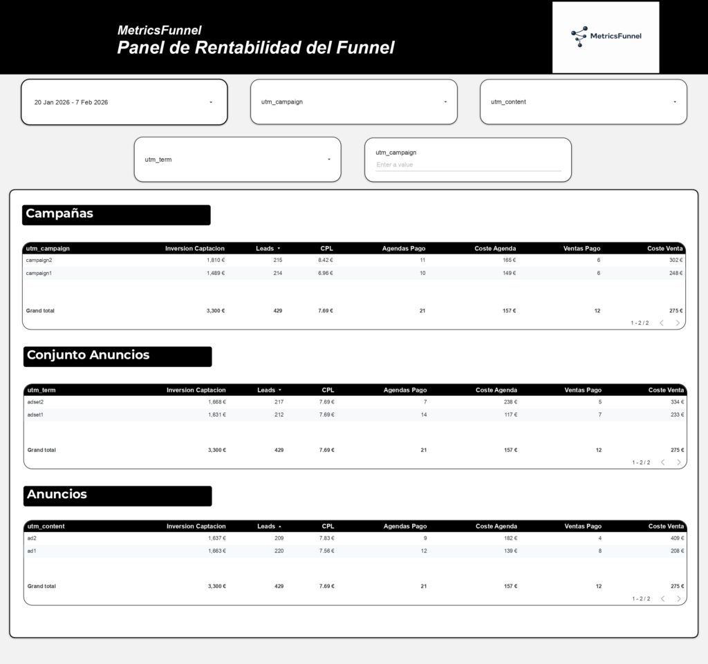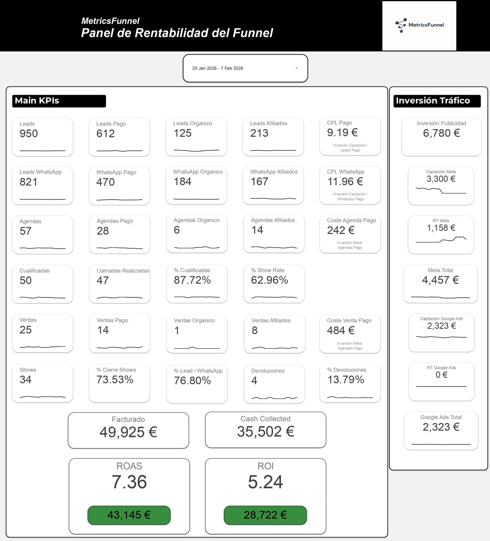 MetricsFunnel conecta campañas, leads, agendas y ventas para que sepas qué anuncios generan dinero, dónde se pierden las ventas y cuánto beneficio real deja tu funnel.